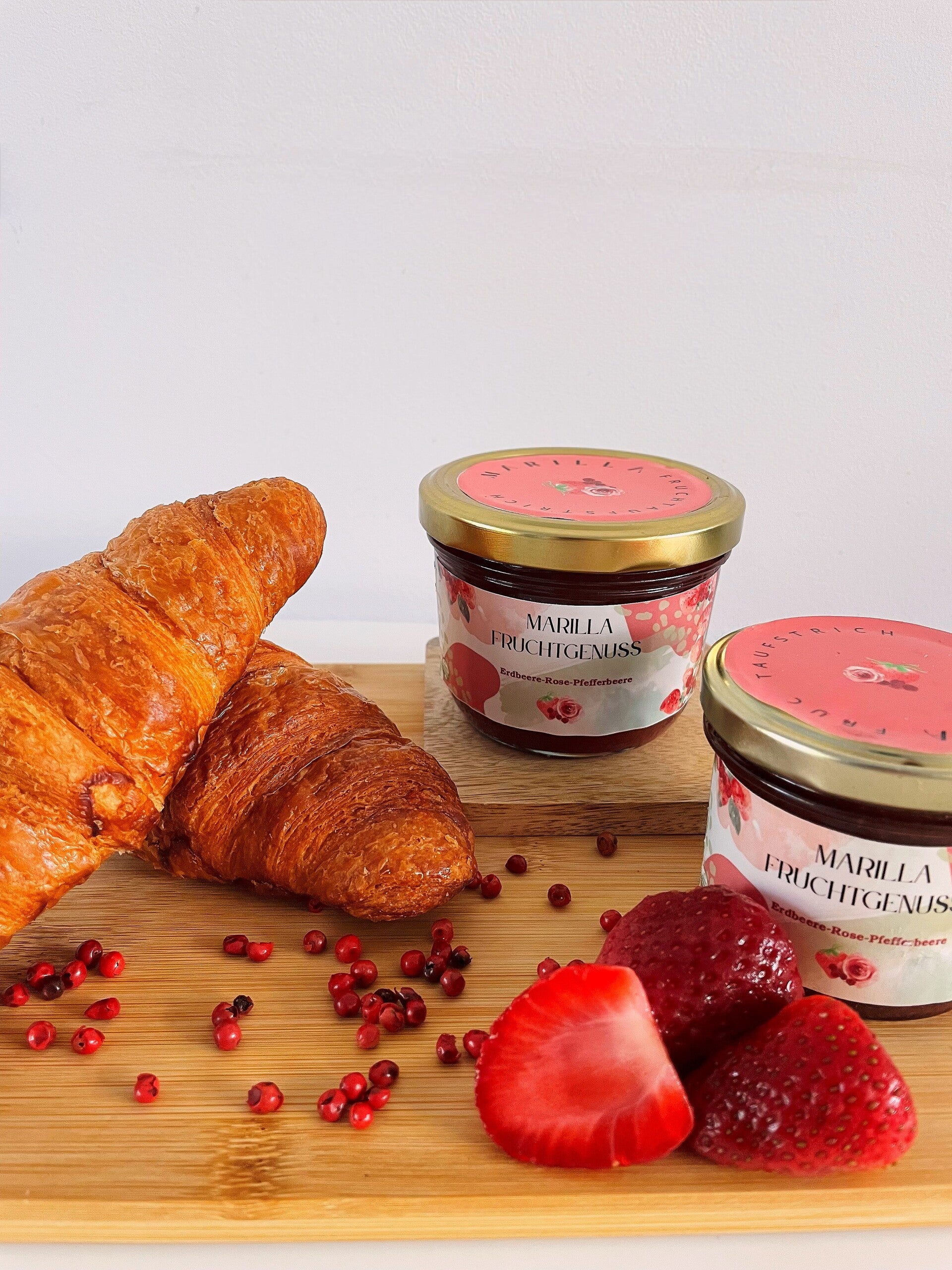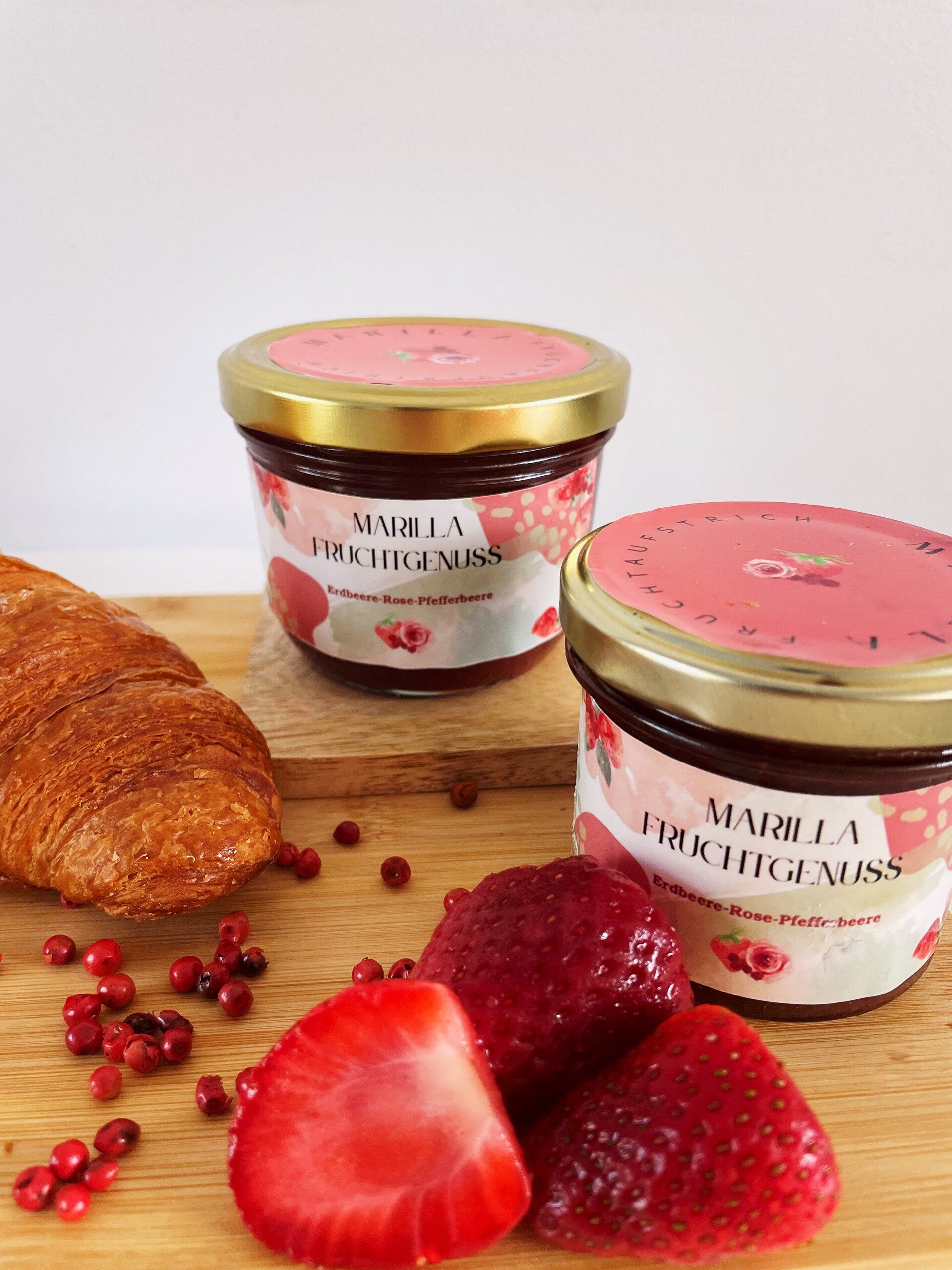 Sonnengereifte regionale Erdbeeren verfeinert mit edlen Rosenwasser und handerlesenen rosa Pfefferbeeren.